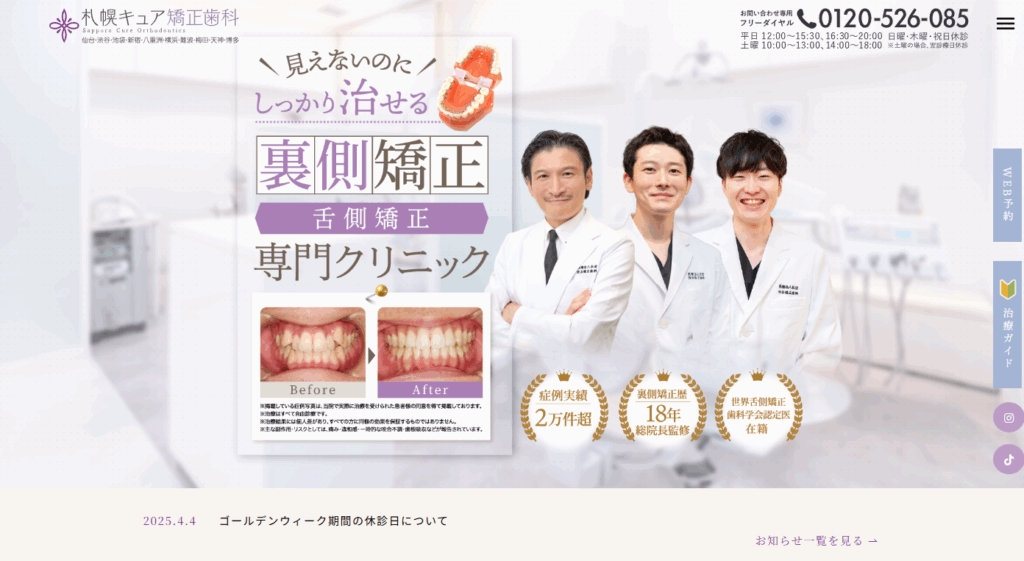 札幌キュア矯正歯科は、裏側矯正歯科18年の歴を持つ、総院長の東海林貴大歯科医師が監修しているクリニックです。