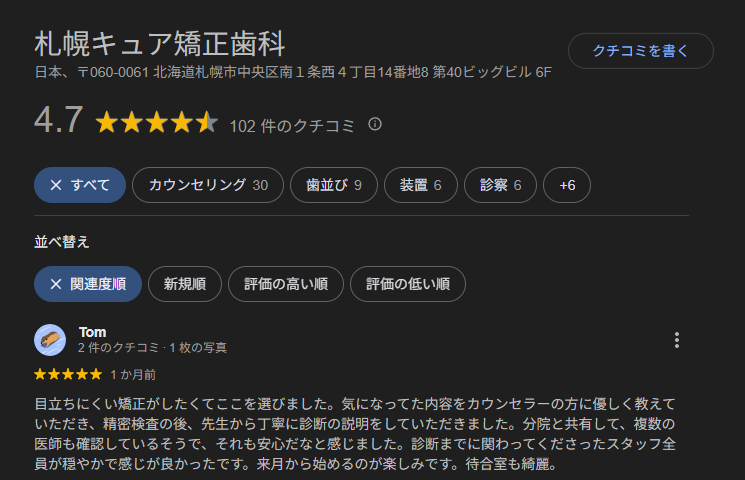 ネットで公開されていた札幌矯正歯科の口コミを紹介します。歯科の口コミサイトは、「日本歯科医療評価機構」「teech」とありましたが、今回は1番口コミの投稿が多いGoogle口コミを見てみました。